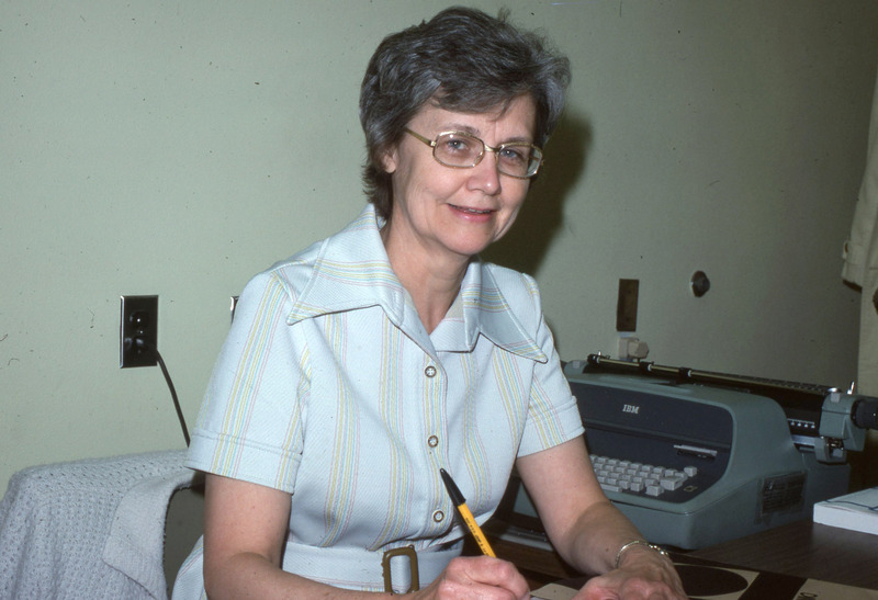 A Librarian (possibly Alice Wilson?) smiling at the camera while in the staff area of Pacific University's Scott Library in July, 1978. This is one of a set of photographs that appears to have been posed in order to demonstrate the range of work that was taking place in the library.