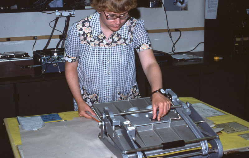 A worker, possibly a student, operating a machine at Pacific University in July, 1978. They are pressing a set of leaves between the metal plates; it may be some sort of binding or printing machine. This is one of a set of photographs that appears to have been posed in order to demonstrate the range of work that was taking place in the audio-visual department of Pacific University.