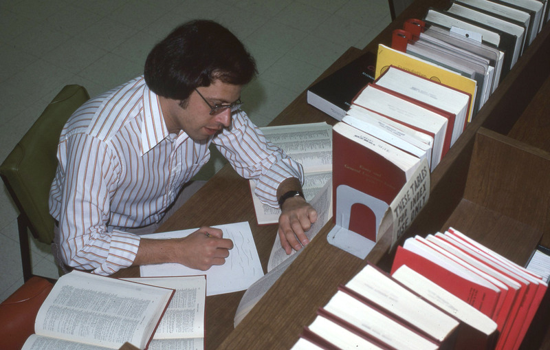Librarian Alex Toth of Pacific University, consulting reference sources in Scott Library in July, 1978. The photograph appears to be staged in order to demonstrate his work: the notes he has written on the page are only scribbles.