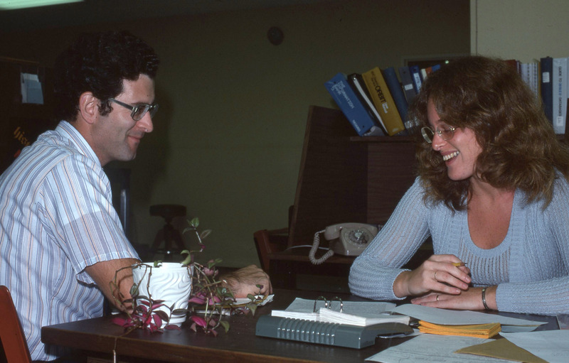 Two Pacific University Librarians talking while standing at a desk in Scott Library in July, 1978. The man appears to be taking notes. This is one of a set of photographs that appears to have been posed in order to demonstrate the range of work that was taking place in the library.