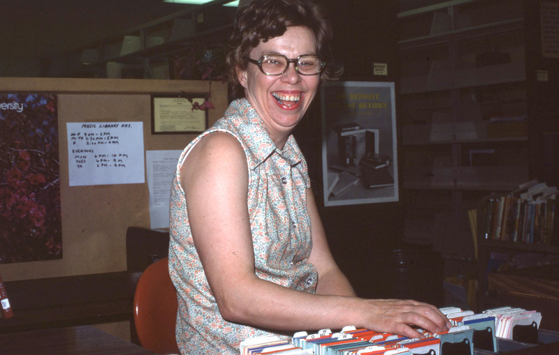 A Pacific University librarian (possibly Helen Dugdale), laughing at the camera while she works with a set of index cards. This was taken in Scott Library in July, 1978. This is one of a set of photographs that appears to have been posed in order to demonstrate the range of work that was taking place in the library.