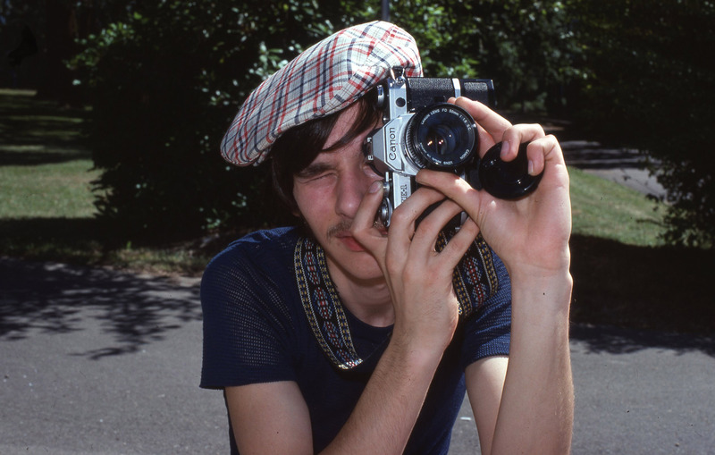A portrait of a photographer, probably a Pacific University student (or possibly staff), holding a Canon 35mm camera. This photograph was taken on the Pacific University campus in July, 1978. This is one of a set of photographs that appears to have been posed in order to demonstrate the range of work that was taking place in the audio-visual department of Pacific University.