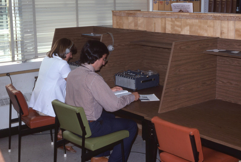 Two people, possibly Pacific University students or staff, listening to reel-to-reel recordings in Scott Library in July, 1978. This is one of a set of photographs that appears to have been posed in order to demonstrate the range of work that was taking place in the library.