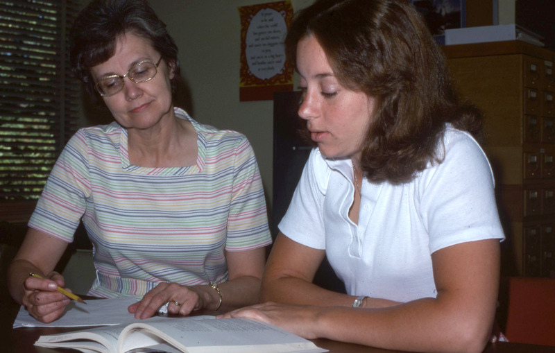 A Pacific University librarian (possibly Mary Ann Mellbye?) assisting a young woman, probably a Pacific University student, with a book in Scott Library in July, 1978. This is one of a set of photographs that appears to have been posed in order to demonstrate the range of work that was taking place in the library.