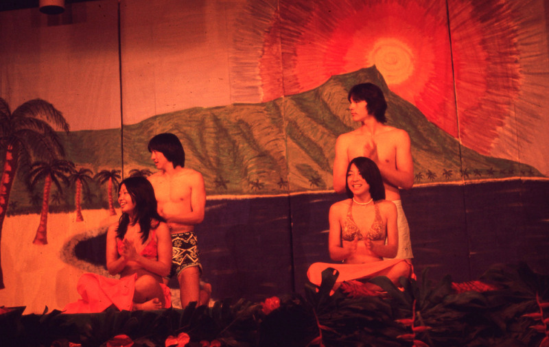 A group of Pacific University students performing on stage at the university's annual Lu'au in 1975. All are seated or kneeling; the men wear malo while the women wear skirts with bikini tops. The photographer, Peg Osland, was on the staff of Pacific's publicity department.