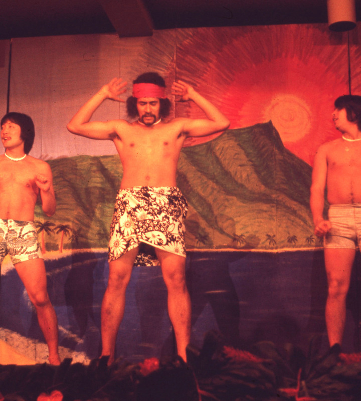 Several male Pacific University students performing on stage at the university's annual Lu'au in 1975. The photographer, Peg Osland, was on the staff of Pacific's publicity department.