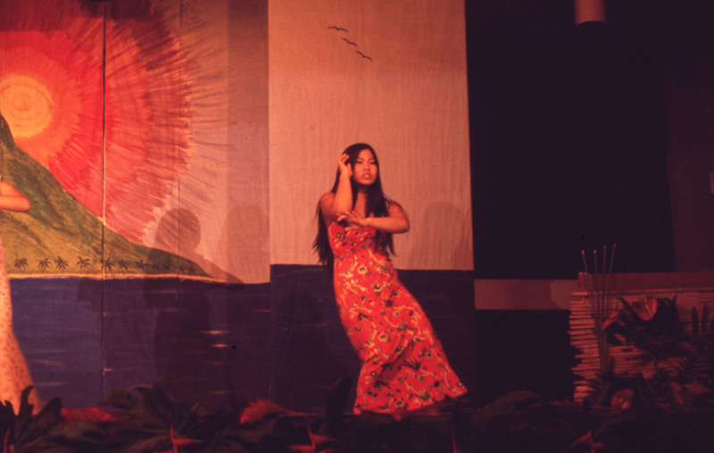 A Pacific University student performing the hula on stage at the university's annual Lu'au in 1975. The photographer, Peg Osland, was on the staff of Pacific's publicity department.
