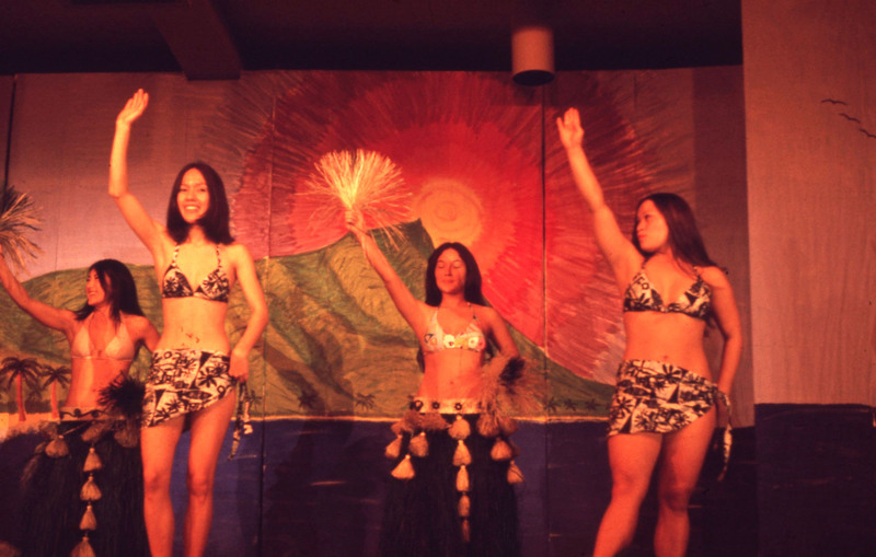 A group of women students performing a Tahitian-style dance on stage at Pacific University's annual Lu'au in 1975. Two are wearing Tahitian-style grass skirts and holding grass hand tassels; the other two are wearing matching bikini tops and skirts. The photographer, Peg Osland, was on the staff of Pacific's publicity department.