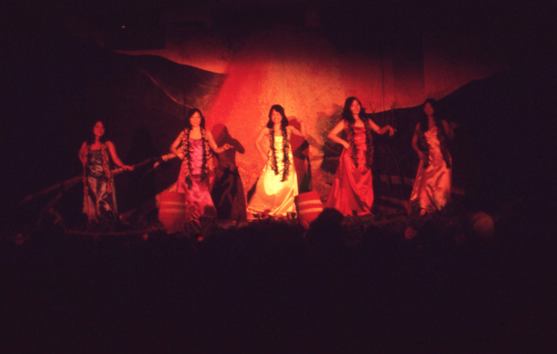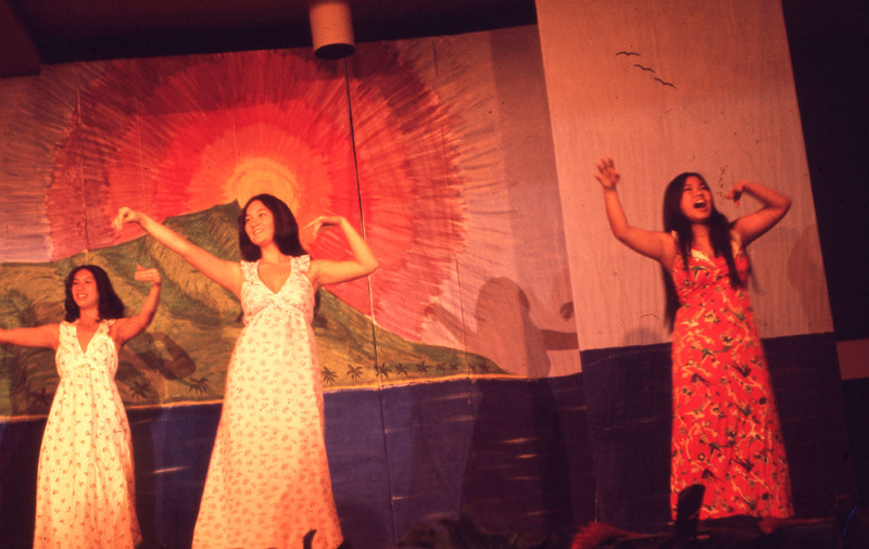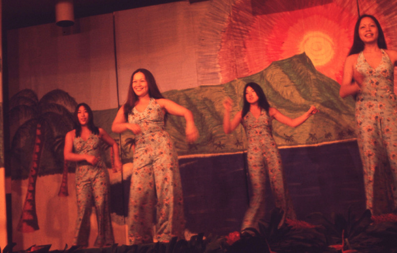 Pacific University students performing the hula on stage at the university's annual Lu'au in 1975. The photographer, Peg Osland, was on the staff of Pacific's publicity department.