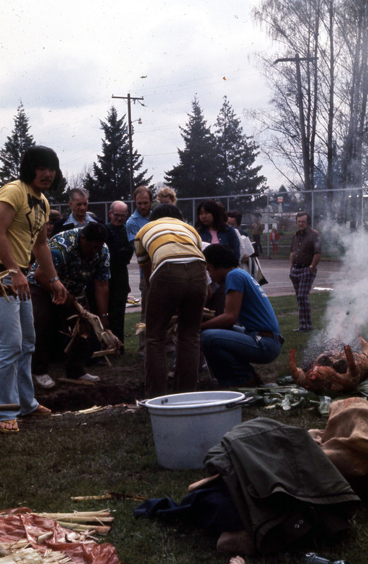 Students and family members from Hawaii tending the pit for the kalua pig roast at the 1976 Lu'au at Pacific University. Other community members watch in the background.
