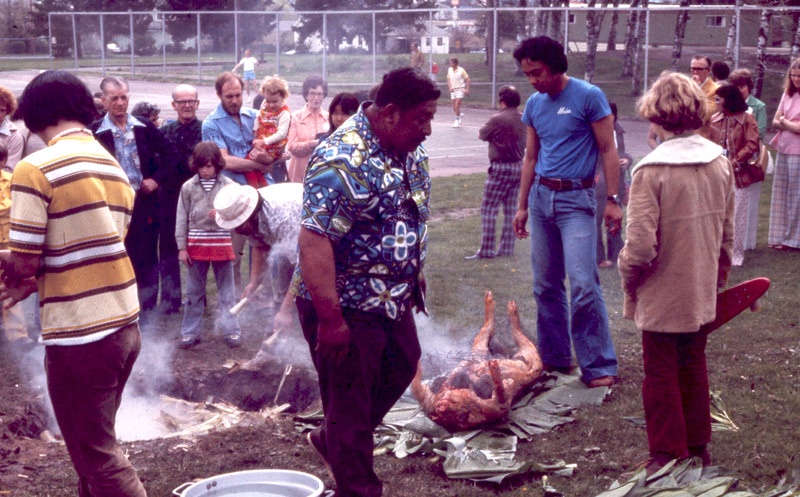 A roasted kalua pig sits steaming on the ground next to the roasting pit at the 1976 Pacific University Lu'au. Students and family members from Hawaii are tending the pit, while community members watch from the background.