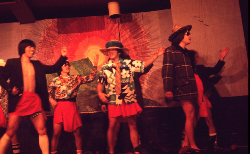 A group of male Pacific University students performing at the university's 1975 Lu'au. They appear to be dressed as tourists and are performing a humorous skit or dance. The photographer, Peg Osland, was on the staff of Pacific's publicity department.