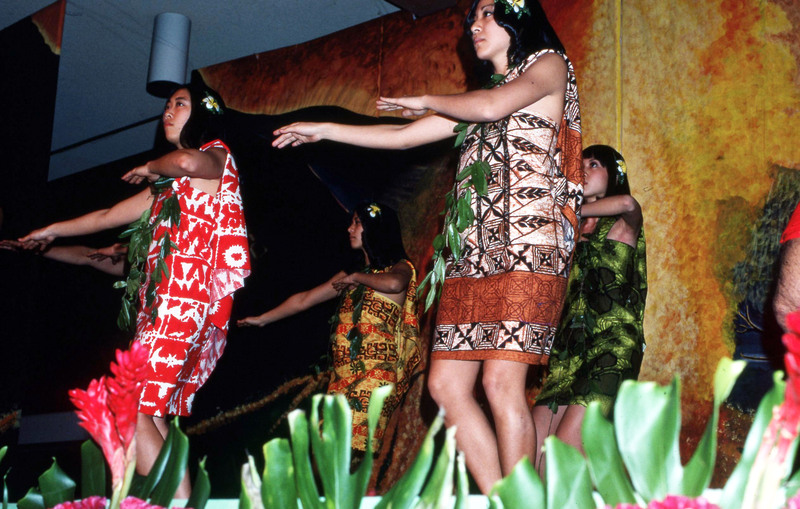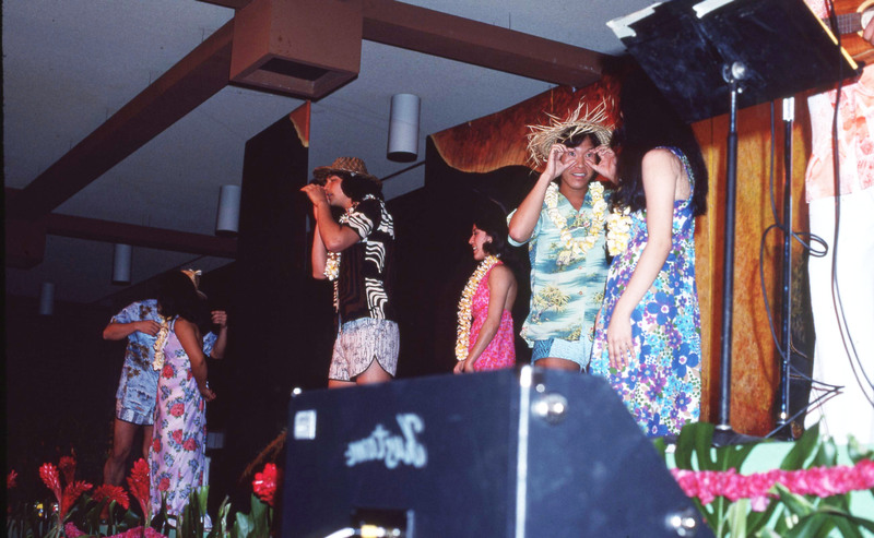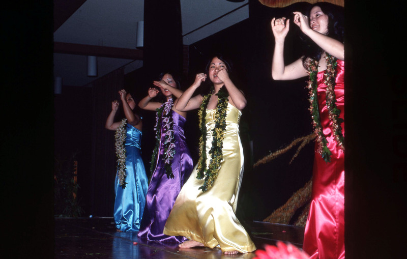 A set of women dancers wearing satin dresses and maile-style leis, performing at Pacific University's annual Lu'au in 1976. These may have been "Princesses" in the Lu'au's "Court". In many years, the Lu'au featured performances of women dancers each wearing a different colored dress, who would each represent one of the Hawaiian islands. They would perform solo dances for a "King" and "Queen," who would watch from the stage.