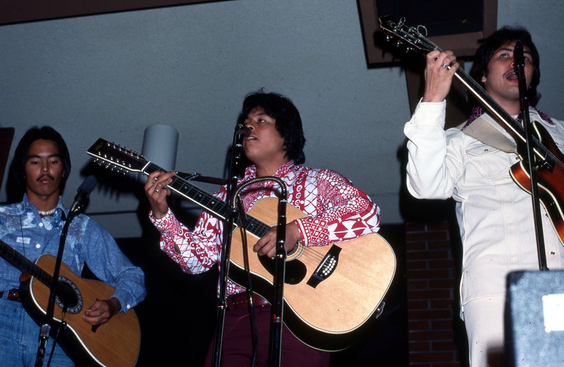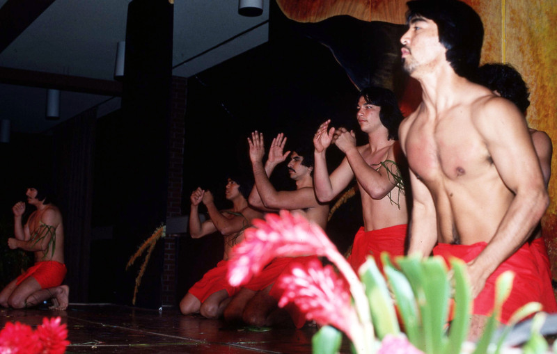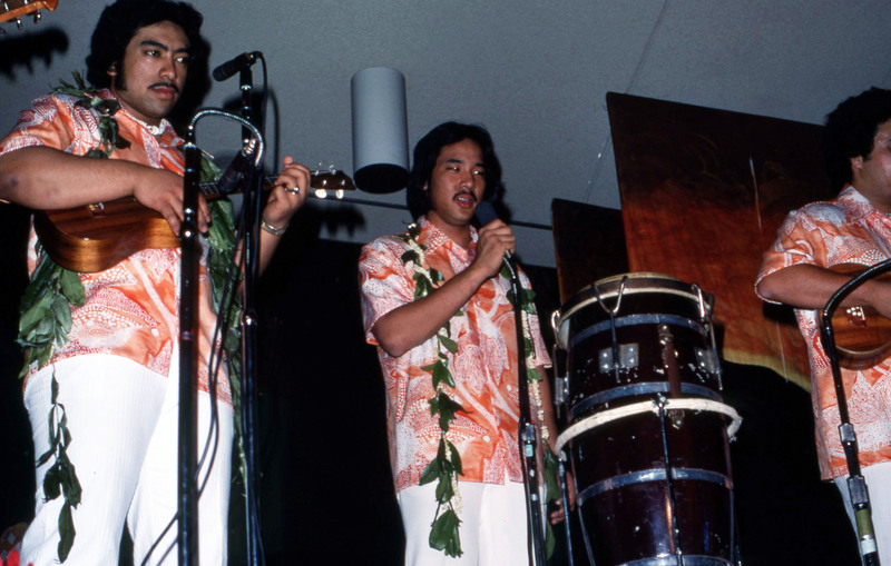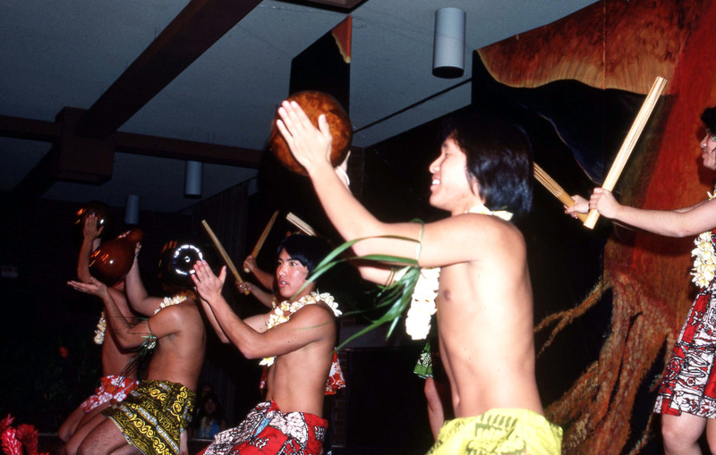 Student dancers performing at Pacific University's annual Lu'au in 1976. The male performers in the foreground appear to be holding ipu gourds, while the women in the background hold pu'ili sticks.