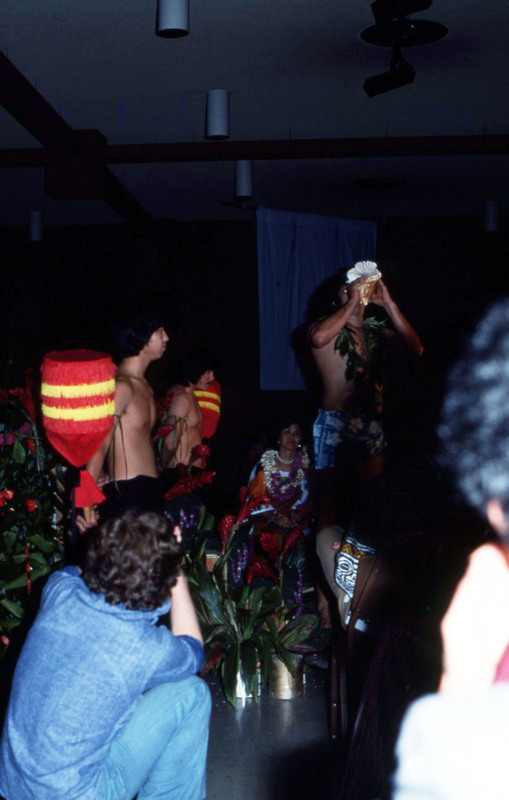 The entrance of the "Royal Court" through the audience, at Pacific University's annual Lu'au in 1976. The Lu'au featured a "King" and "Queen," who would preside over the festivities. They were announced by the student in the background who is blowing the conch. Red and yellow staffs meant to represent "kāhili," the traditional feathered symbols of Hawaiian royalty, are also visible.