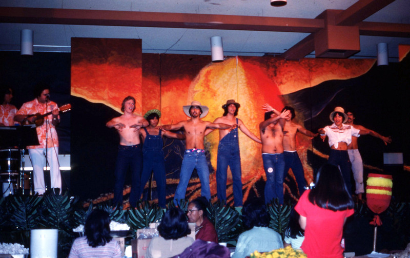 A group of male student performers wearing jeans and overalls at Pacific University's annual Lu'au in 1976. The Lu'au's musicians are visible on the left. The stage backdrop depicts a volcanic eruption.