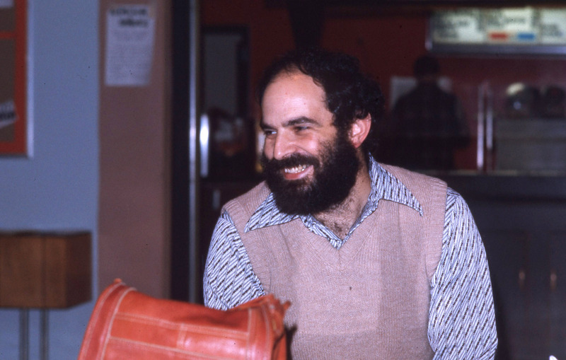 A man, possibly a professor, seated in Pacific University's Washburne Hall. A wall-mounted menu and service counter are visible in the background. The original slide was printed in November, 1976.