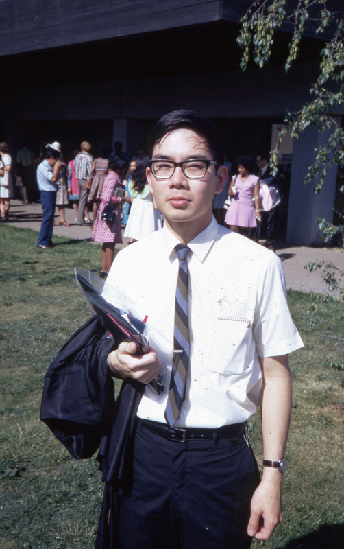 A student who appears to have just graduated, holding his robe, tam and possibly his diploma, during Pacific University's Commencement in May, 1973. The Stoller Center appears in the background.