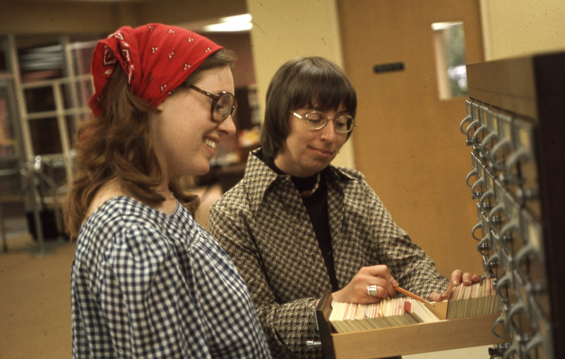 Pacific University librarian Donna Shaver assisting a student with the card catalog in Scott Library. This photograph appears to have been posed in order to illustrate the services available to students at Pacific; it may have been taken by a staff photographer. The original slide was printed in July, 1975.