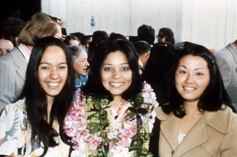A Pacific University student wearing multiple leis, flanked by two other students. This was probably taken just after one or more of these students graduated, as several people in the background are wearing graduation caps. The original slide was printed in March 1976, but the photograph was certainly taken earlier: likely between 1970-1974, based on other images from the same set.