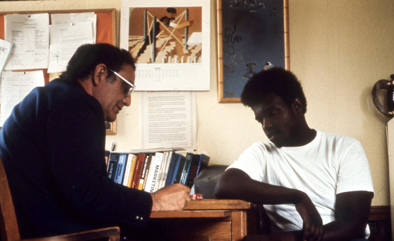 An African-American Pacific University student meeting with a professor, apparently examining an item on the desk together. The professor may be Russell Saunders, who taught business and economics. Books on marketing are visible in the background, along with a calendar and notes pinned to a bulletin board. This photograph was probably taken by a staff photographer to illustrate student experiences, possibly for use in a promotional publication. The slide was printed in March 1976, but is probably a reprint of an earlier photograph, most likely taken circa 1970-1974.