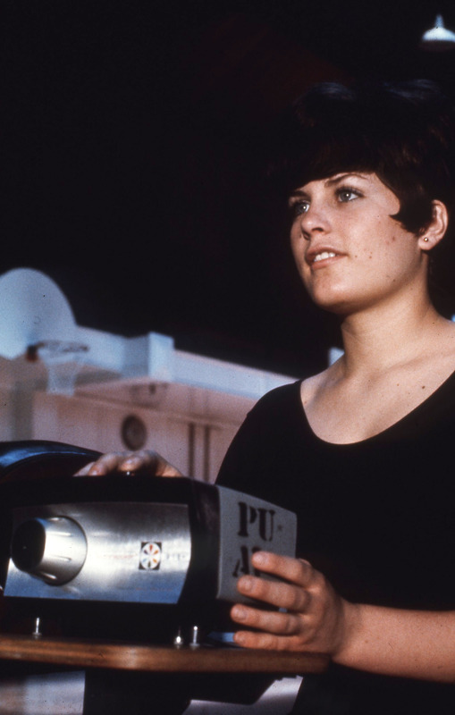 A Pacific University student operating a projector, which has a stencil marked "PU AV" (Pacific University Audio-Visual). The image appears to have been taken during an event in the gym: a basketball hoop is visible in the background. This photograph was probably taken by a staff photographer to illustrate student experiences, possibly for use in a promotional publication. The slide was printed in March 1976, but is probably a reprint of an earlier photograph, most likely taken circa 1970. For another image of the same student, see PUA_PeoSlides_119.