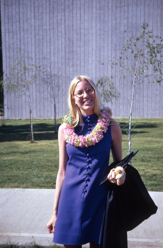 A student wearing a lei who appears to have just graduated, during Pacific University's Commencement in May, 1973. She is holding her robe, tam and diploma.