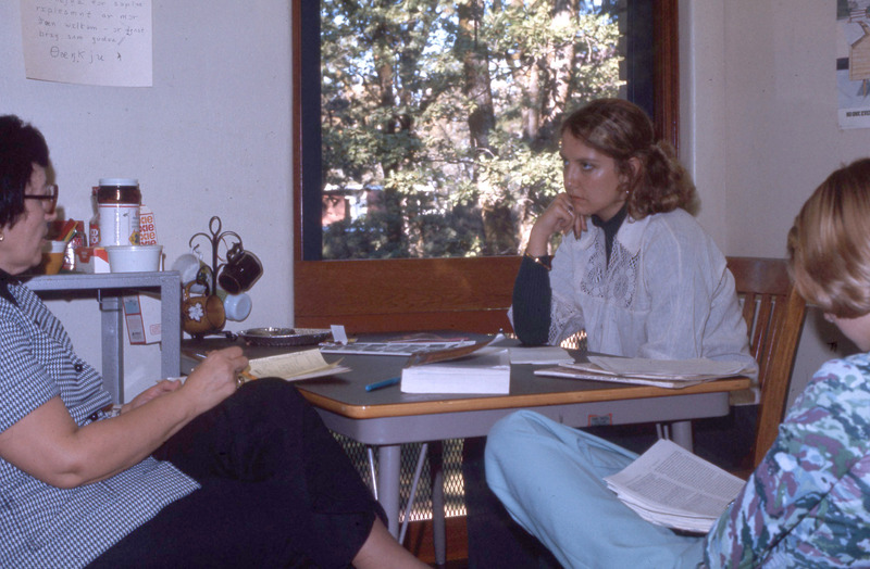 Women seated what appears to be a break room at Pacific University. They may be staff members, or possibly a professor (left) with students. Coffee supplies are in the background; notes, magazines and a book are on the table. The notice posted on the wall behind them is written phonetically, and appears to be asking people to bring replacement supplies or "goodies" to the room. The original slide was printed in October, 1976.