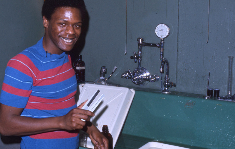 A student working in what appears to be Pacific University's photography lab or darkroom. He is holding a tool, possibly for working with negatives. Plastic film canisters, measurement tubes, trays, chemicals, wires for drying prints and a sink appear behind the student. The original slide was printed in October, 1976.