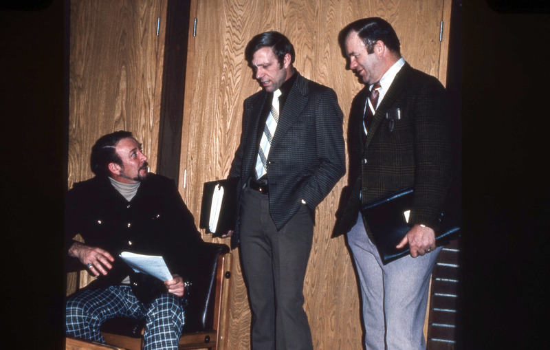 Three men, presumably all Pacific University professors, wearing plaid outfits and having a discussion. The slide was printed in March 1976, but is probably a reprint of an earlier photograph, most likely taken circa 1970-1974.