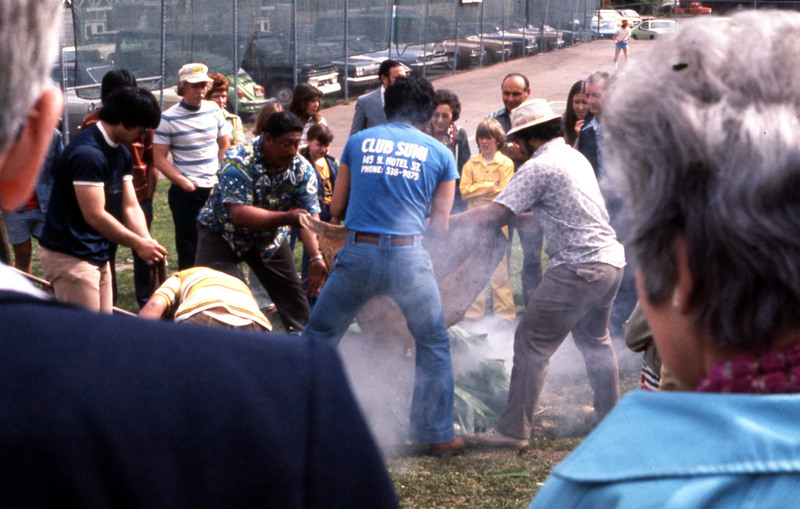 Students and family members from Hawaii roasting a pig for the 1976 Lu'au at Pacific University, while a crowd of observers looks on. The university's tennis courts are visible in the background.