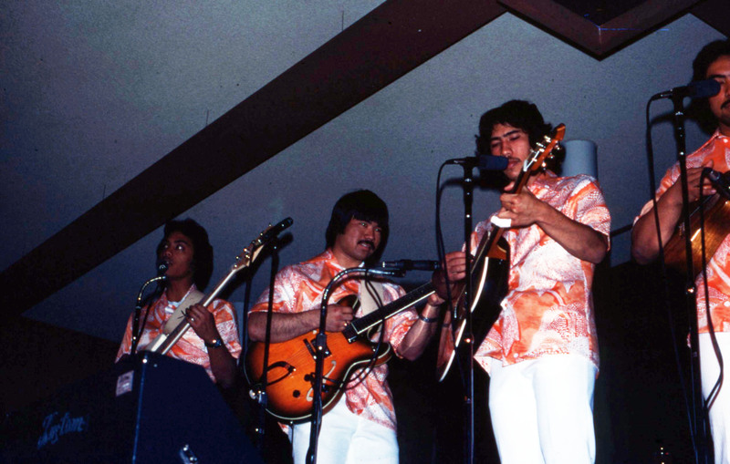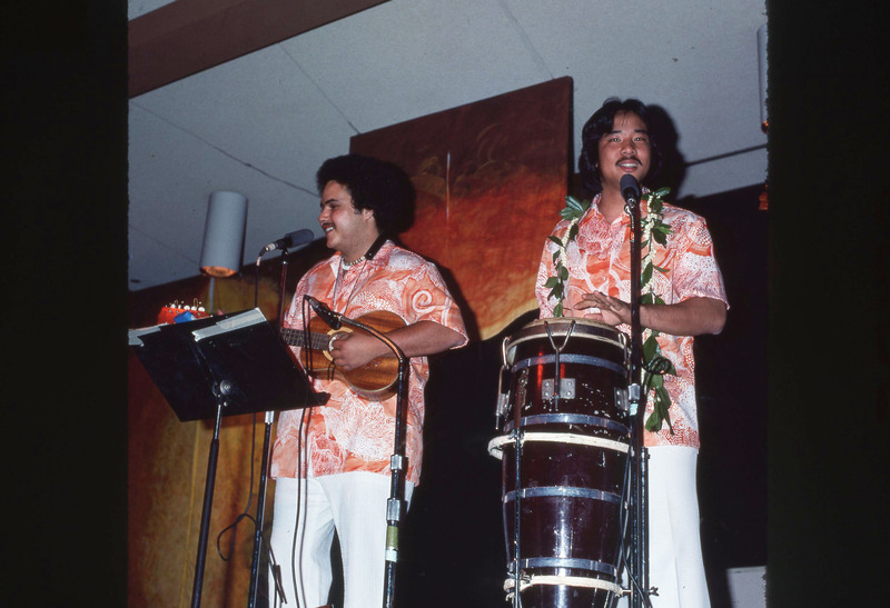 Two male musicians, one playing a ukulele while the other plays a drum, at Pacific University's annual Lu'au in 1976. They are wearing matching aloha shirts and white pants. The backdrop depicts a volcanic eruption.
