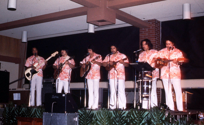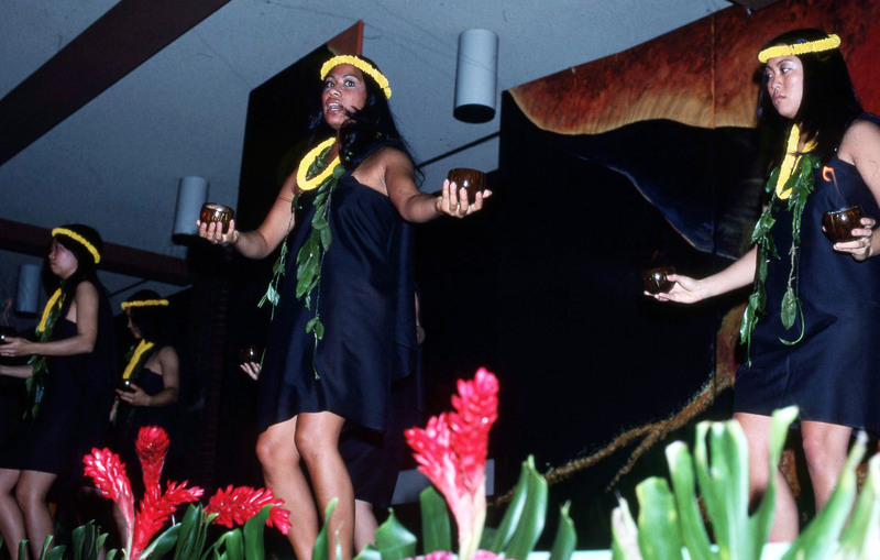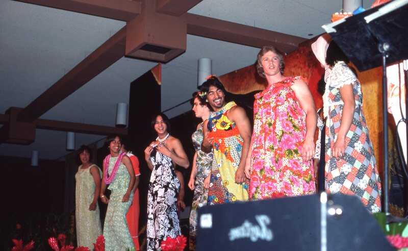 Five women dancers wearing satin dresses and maile-style leis, performing at Pacific University's annual Lu'au in 1976. These may have been "Princesses" in the Lu'au's "Court". In many years, the Lu'au featured performances of women dancers each wearing a different colored dress, who would each represent one of the Hawaiian islands. They would perform solo dances for a "King" and "Queen," who would watch from the stage. The backdrop on the set depicts a volcanic eruption.
