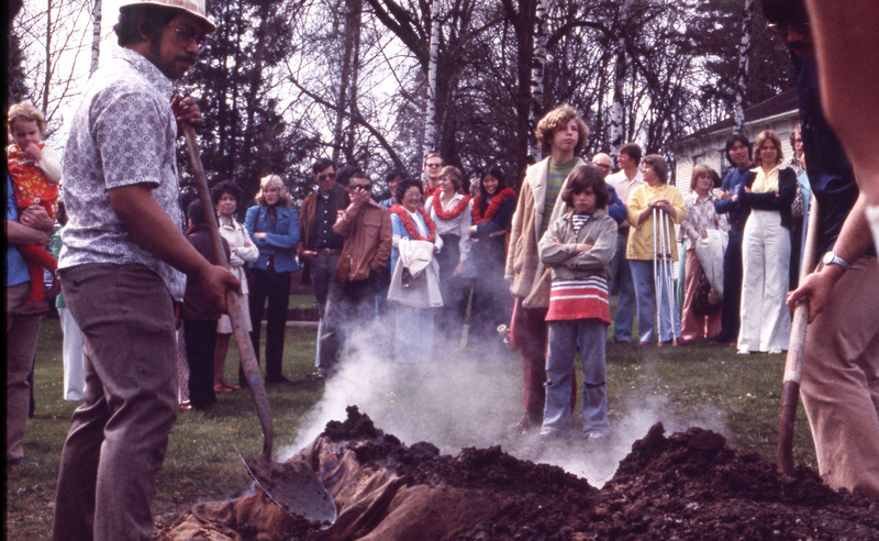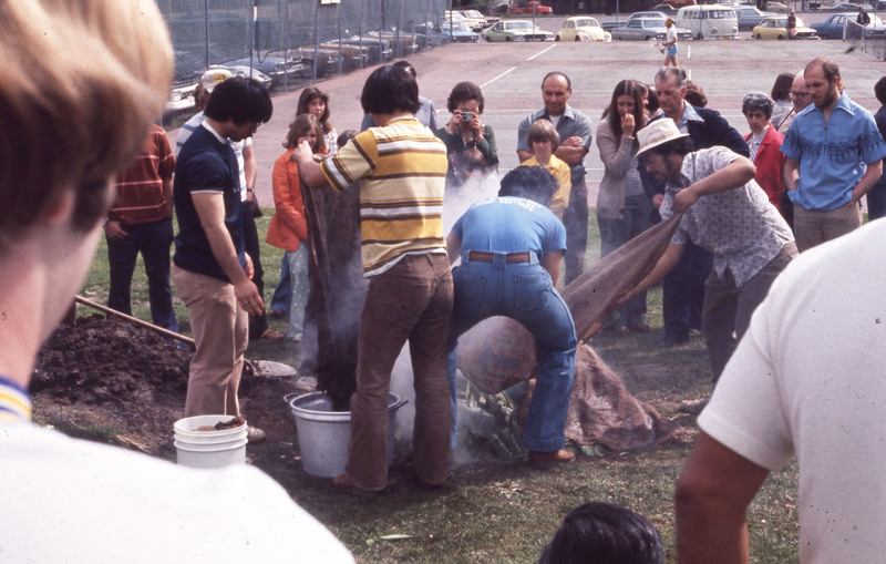 Students and family members from Hawaii shoveling dirt onto a roasting pit. They are preparing kalua pig for the 1976 Lu'au at Pacific University. Attendees, some wearing leis, watch in the background.