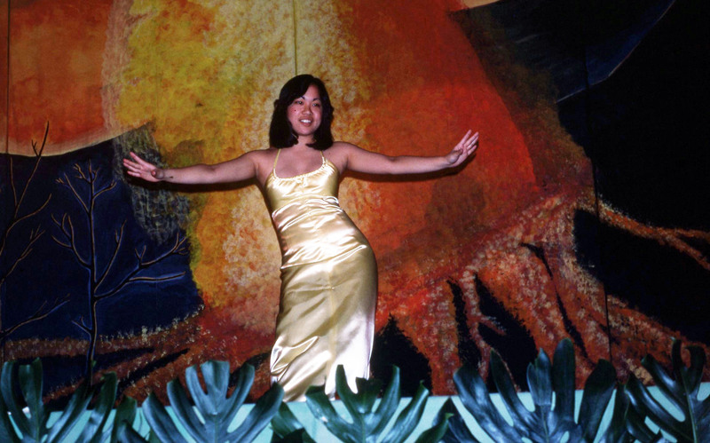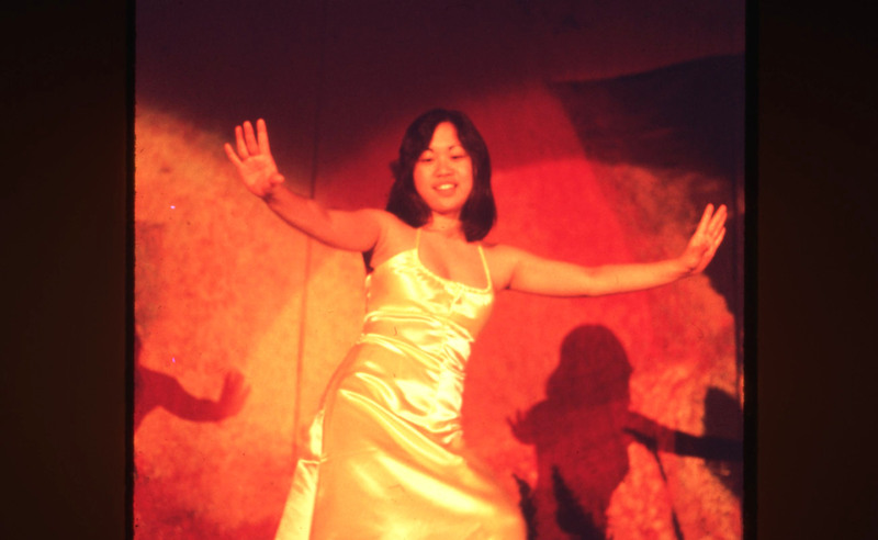 Dancer in a red satin dress at the annual Lu'au at Pacific University in 1976. She may have been portraying a "princess". In many years, the Lu'au featured performances of women dancers each wearing a different colored dress, who would each represent one of the Hawaiian islands. They would perform solo dances for a "King" and "Queen," who would watch from the stage. The backdrop on the set depicts a volcanic eruption.