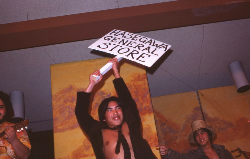 A Pacific University student holding a sign that reads, "Hasegawa General Store," during a performance at the 1977 annual Lu'au. The Hasegawa General Store is an historic store located in Hana, Maui.
