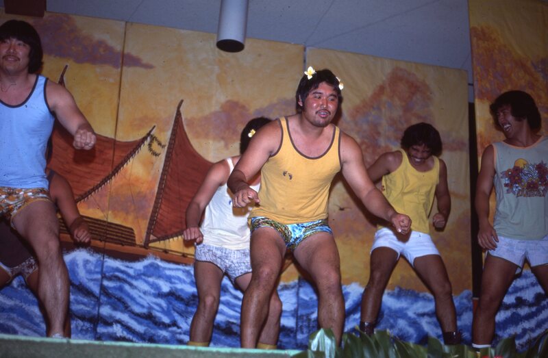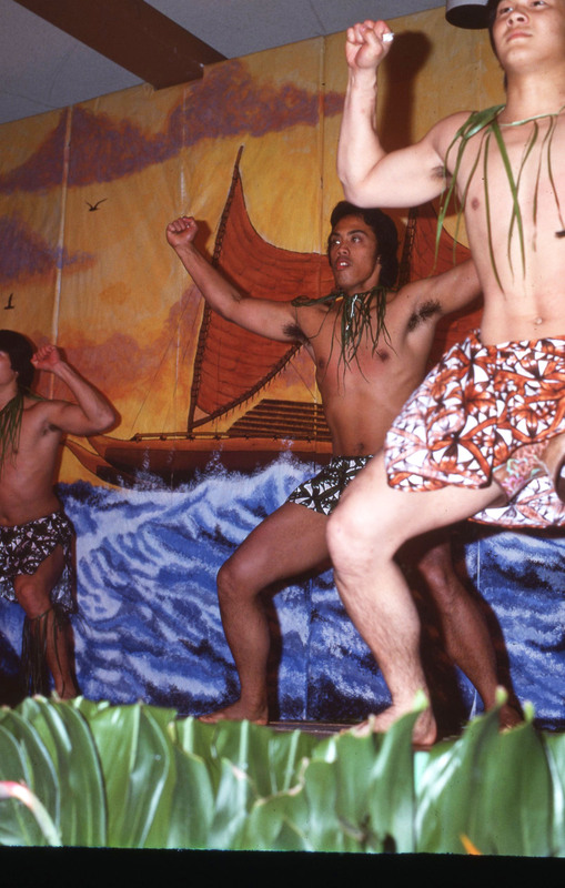 Male Pacific University students performing a dance at the annual Lu'au in 1977. The original slide is labeled "Yanigitani," which may be the name of one of the performers, or may be the name of the photographer.
