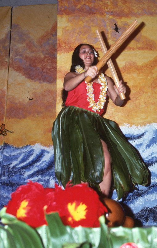 A female performer wearing pink orchids in her hair, backstage at Pacific University's annual Lu'au in 1977. Based on other sources from this event, this is likely "Ernette Barreira, a sophomore speech pathology major, [who] sang with the band" (The Index, Apr. 28, 1977).