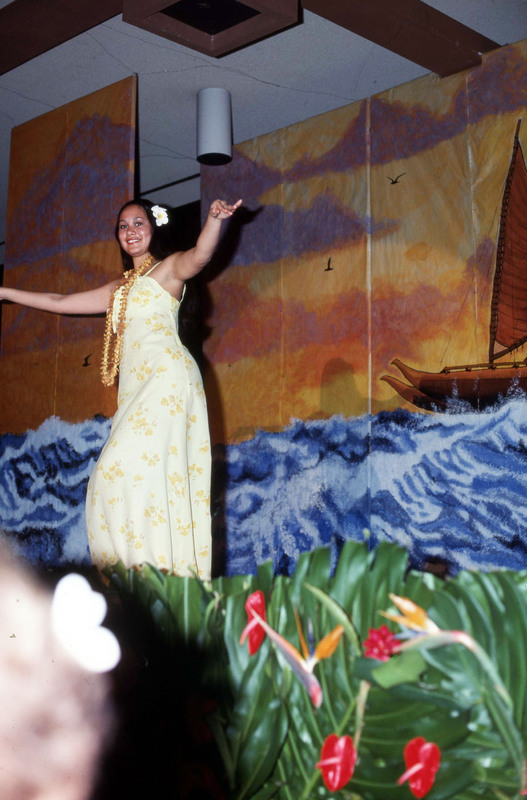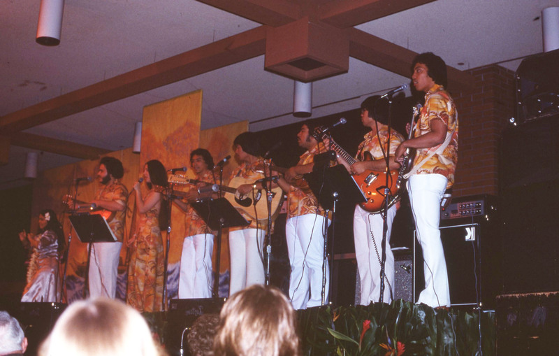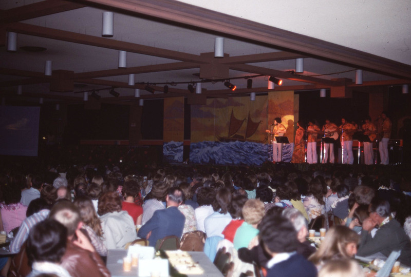 An audience watches a performer standing at the microphone next to a line of musicians, who are on stage at Pacific University's annual Lu'au in 1977. The student newspaper later described the musical performers at this Lu'au: "The band provided beautiful solos done by Danny Sagadraca, Lyle Galdeira, and Gary Pacarro. Music arrangements were provided by Keoki Awai. For the first time, the band featured a female vocalist. Ernette Barreira, a sophomore speech pathology major, sang with the band." (The Index, Apr. 28, 1977)