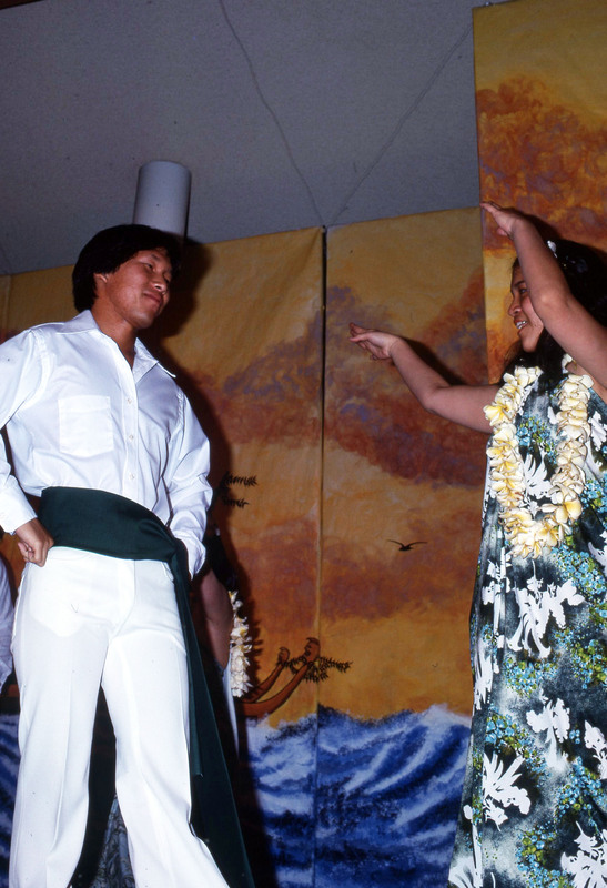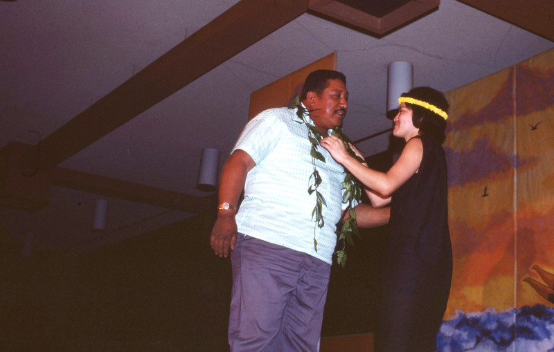 A woman student performer with an older man on stage at Pacific University's annual Lu'au in 1977. She appears to have just placed a maile-style lei around his shoulders, probably indicating that he was an honored guest. He may be an older relative of one of the students participating in the Luau: Relatives from Hawai'i often helped to organize and fund the event.