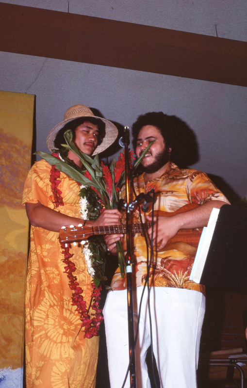 Two male students, one of whom is in drag, dressed in orange outfits on stage at Pacific University's annual Lu'au in 1977. One performer is holding a ukulele, while the other holds a bouquet of red ginger flowers.