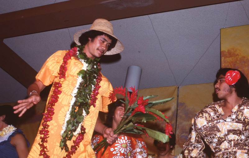 Several male dancers performing in drag at Pacific University's annual Lu'au in 1977. The man in front is wearing an orange dress and carrying a bouquet of red ginger flowers.