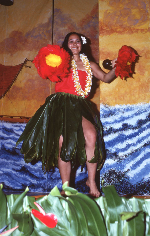 Two women students from Pacific University perform a Tahitian-style dance at the university's annual Lu'au in 1977. The original slide is labeled "Yanigitani," which may be the name of one of the performers, or may be the name of the photographer. The dancers holding hand tassels and wearing tasseled grass skirts.