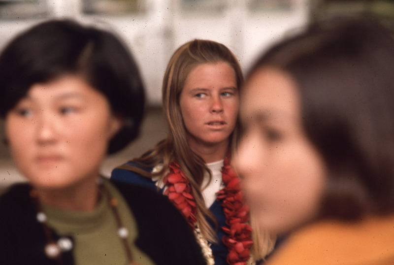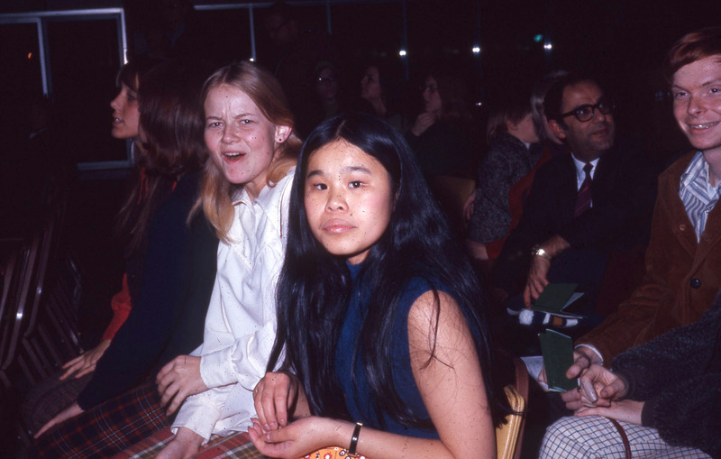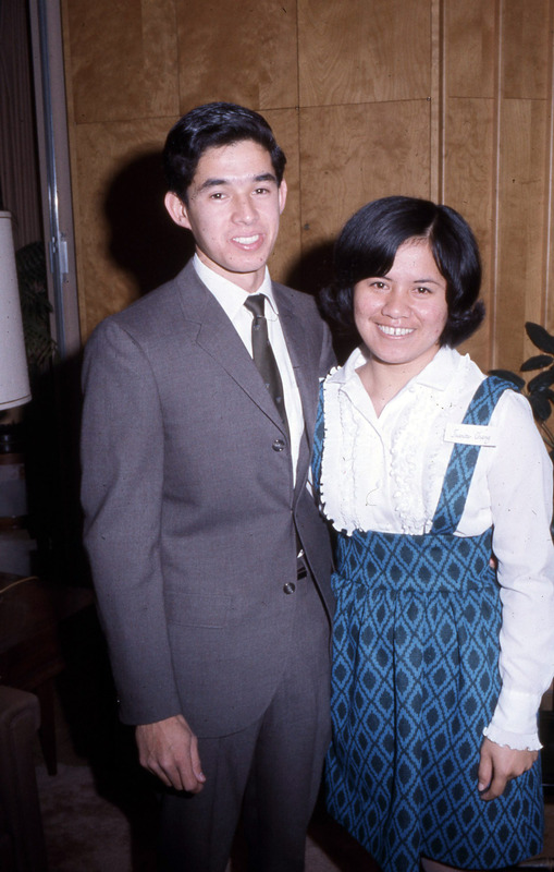 Jill Matsui (Pacific University Class of 1972) with a friend, both dressed semi-formally, during an event at Pacific circa 1970. For two other images taken at the same event, see PUA_LuauSlides_275 and PUA_PeoSlides_111.