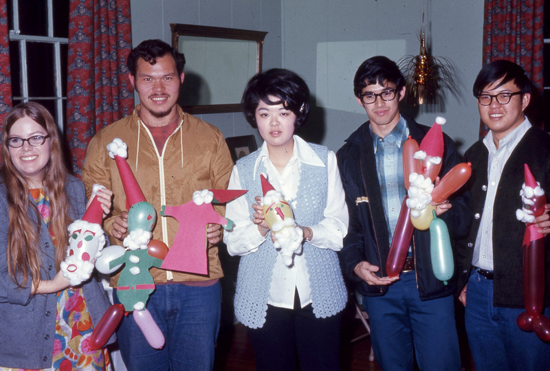 Students, probably all members of Pacific University's Haumana O Hawai'i (Hawaiian Club), holding up Christmas-themed balloon crafts. Most of their balloons look like Santa Claus, but one in green appears to be the Grinch. The student holding the Grinch is probably Mike Ben (Class of 1971); the others are unidentified. This photograph was taken in December, 1970.