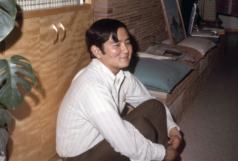 Joey Takahashi and another Pacific University student at a Haumana O Hawai'i (Hawaiian Club) social event, probably in October 1970. This photograph was likely taken at the home of Professor Fred Scheller, who lived in Aloha, Oregon. Scheller was an advisor to Haumana O Hawai'i, and appears to have hosted many social events for Hawaiian students around this time period. The original slide is labeled: "Haw. 1970."