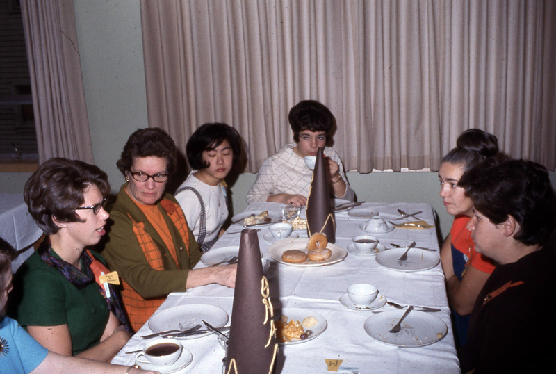 A meeting of women student members and/or alumni of Pacific University's Theta Nu Alpha sorority. They are drinking coffee, eating pastries and talking around a table. This photograph was likely taken circa 1970.