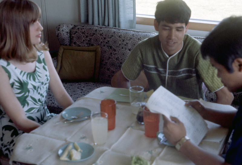 A group of Pacific University students eating at a table at Professor Fred Scheller's house in Aloha, Oregon, circa 1970. Scheller was an advisor to Haumana O Hawai'i (Hawaiian Club), and appears to have hosted many social events for Hawaiian students around this time period.