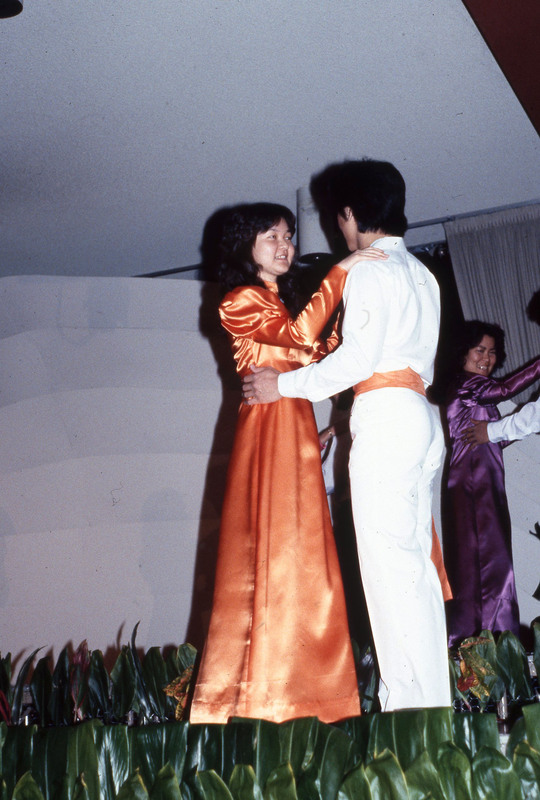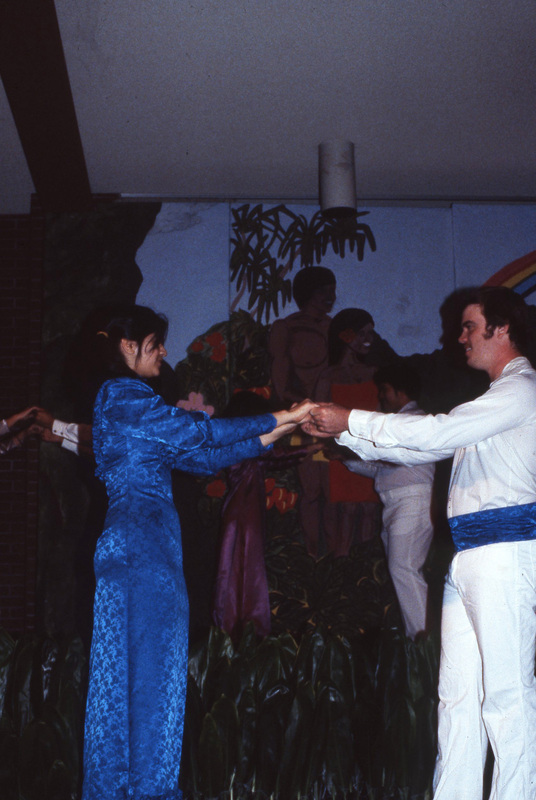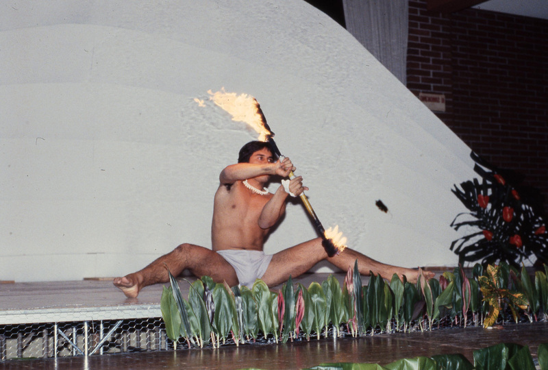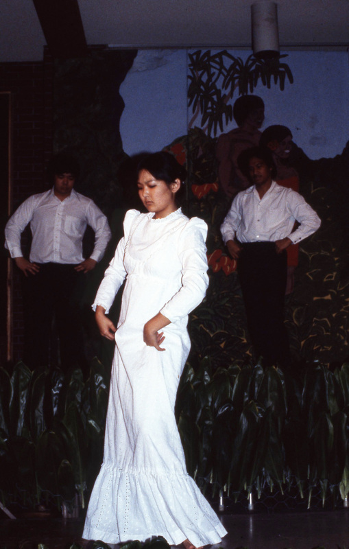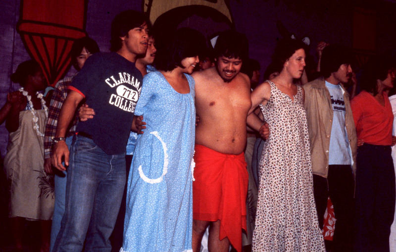 A woman performs a Tahitian-style dance on stage at Pacific University's annual Lu'au in 1982. She is wearing a tasseled grass skirt and headress, and is holding grass hand tassels.