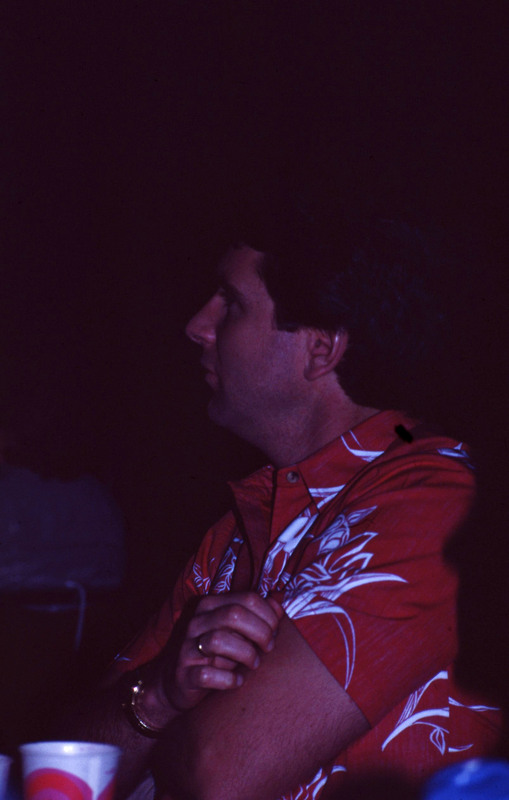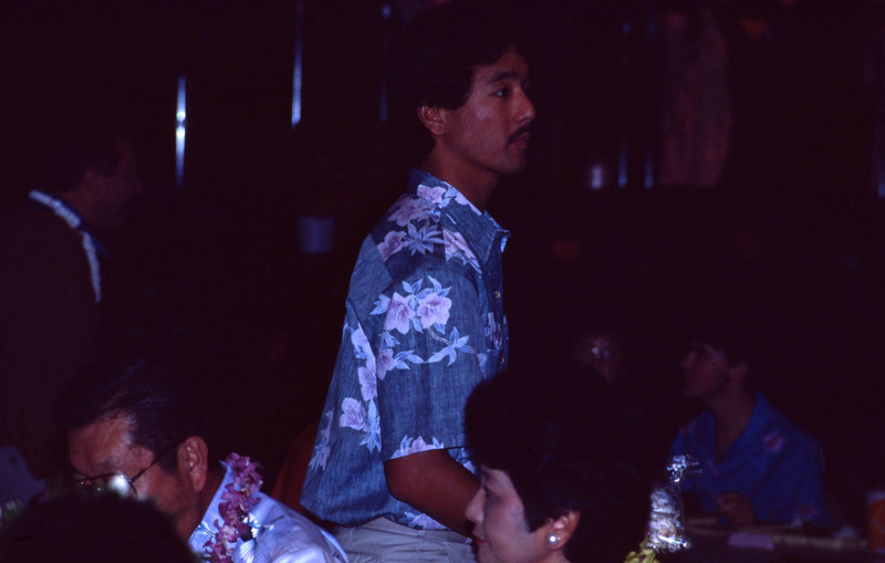A man, probably a student, attending the kalua pig dinner at Pacific University's annual Lu'au in 1986. Several other members of the audience are visible around him.